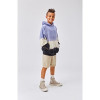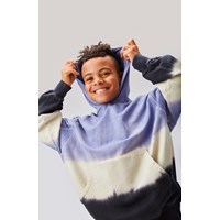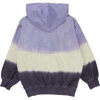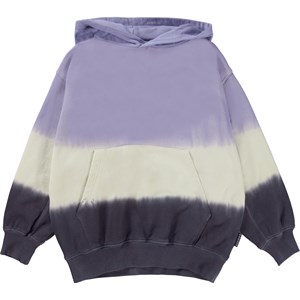 Maxx is a unisex hoodie with wide tie-dye stripes in purple, white and grey. The hoodie has a pouch pocket on the front and a rib edge at the bottom and sleeves. All of Molo's tie-dye is made by hand, so each product has its own unique look.