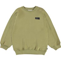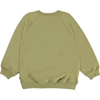 Mir is a sweatshirt in a soft green colour with raglan sleeves and a black logo patch on the left side. Mir has rib at the neck, sleeves and waist.