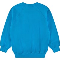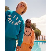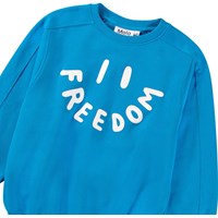 Blue sweatshirt in soft organic cotton with ribbed edges at the neck, sleeves, and bottom of the blouse. The sweatshirt has raglan sleeves and a loose fit with a front print of a smiling face, where the word 'Freedom' forms the mouth.