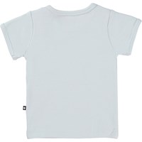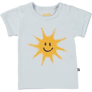 Easy is a baby t-shirt in light blue with a print of the sun on the front. Easy has an easy, two-snap closure on one shoulder.