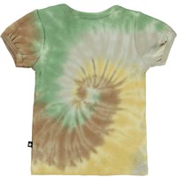 Easy is a baby t-shirt with a tie-dye spiral print. Easy has an easy, two-snap closure on one shoulder.