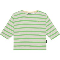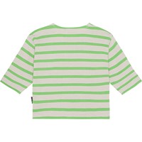 Long sleeve, striped top for small children in soft, organic cotton. The top has a round neck, with a rib edge, is in a loose fit and has an easy, two-snap closure on the left shoulder. It has green and sand coloured stripes and a small, yellow smiling face embroidered on the chest.