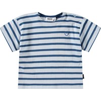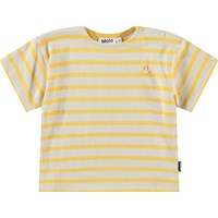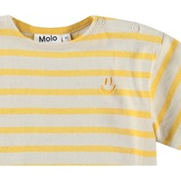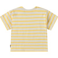T-shirt for the little ones in organic cotton. The t-shirt has yellow and beige stripes and a small yellow smiling face embroidered on the chest. It has a loose fit and a round neckline with button closure on the left shoulder, making it easy to put on and take off.