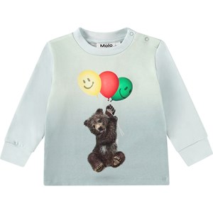 Organic cotton jersey top in blue colour for the little ones. The top has long sleeves, ribbed cuffs on the sleeves, and two poppers on the left shoulder for easy dressing. The front features a print of a bear cub with balloons.