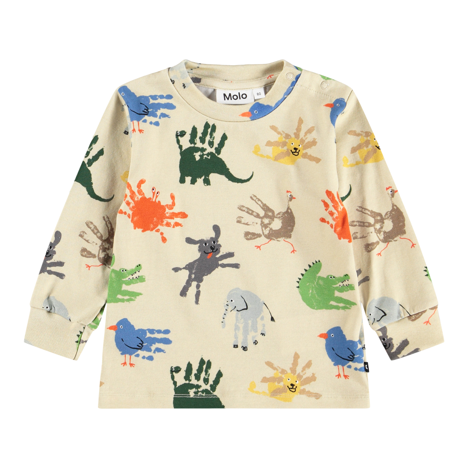 Beige long-sleeved top for the little ones made of organic cotton jersey. On the long-sleeved top, there is a colorful handprint of various animals. The long-sleeved top offers good flexibility , long sleeves and ribbed cuffs. It also has two snap buttons on the left shoulder to make it easy to put on.