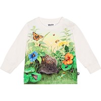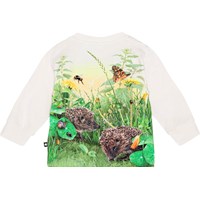 Long sleeve, off-white top for small children in organic cotton jersey. The top is easy to move around in, and it has rib at the sleeves and an easy, two-snap closure on the left shoulder. The t-shirt has a front print of a sweet porcupine and instects in green grass