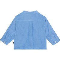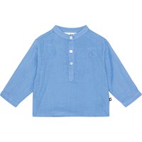 Blue shirt for small children in organic cotton. It has a mandarin collar and a placket with three buttons. The shirt is comfortable and in a loose fit, and it's easy to pull on. It has a small smiling face embroidery on the chest in the same colour. Wear it with mathing trousers in the same fabric for a complete set.
