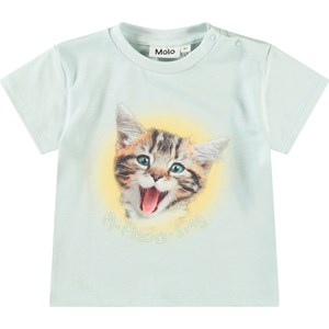 Classic t-shirt for the little ones in organic cotton. The t-shirt has a loose fit, round neckline with ribbed edge, and button fastening on the left shoulder, making it easy to put on. The t-shirt is light blue with a print of a happy kitten.