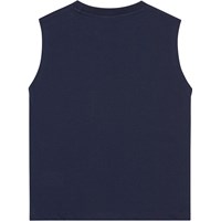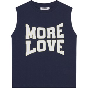Dark blue tank top in soft organic cotton. The tank top has deep armholes and 'More Love' printed on the front.