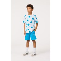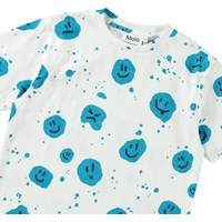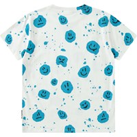 White t-shirt in soft organic cotton with short sleeves and ribbed neckline. The t-shirt has a loose fit and an all-over blue splash print with smiling faces.