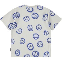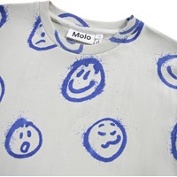 Grey T-shirt made of soft organic cotton with short sleeves and a ribbed neckline. The T-shirt has a loose fit and a blue print of faces with different expressions.