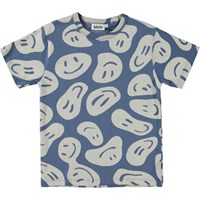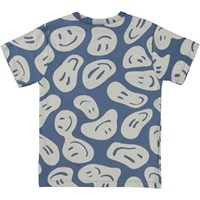 Blue t-shirt in an all over print of a lot of distorted smiley faces in light grey that are floating around like soap bubbles. This t-shirt is in 100% organic cotton, and it has short sleeves and a round neck with a rib edge. It is in a loose fit.