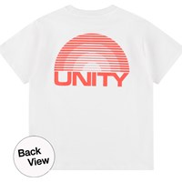 White T-shirt made of soft organic cotton with short sleeves and ribbed neckline. The T-shirt has a loose fit with a print of the text Unity.
