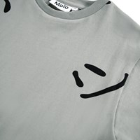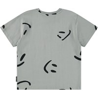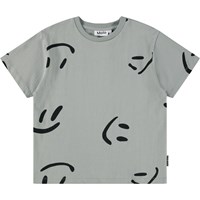 Grey T-shirt made of soft organic cotton with short sleeves and a ribbed neckline. The T-shirt has an oversized fit and a black print of smiling faces.