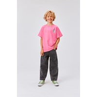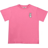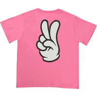 Rodney is a pink, unisex t-shirt with a print of a peace hand sign on the front and back.