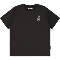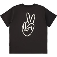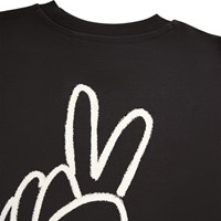 Black T-shirt made of soft organic cotton with short sleeves and a ribbed neckline. The T-shirt has an oversized fit and a white print at the back of a peace hand sign.