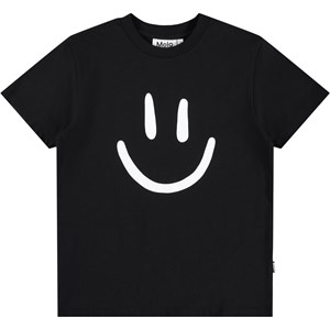 Black T-shirt made of soft organic cotton with short sleeves and a ribbed neckline. The T-shirt has a loose fit with a white print of a smiling face on the front.