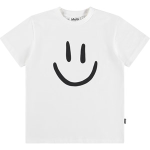 White T-shirt made of soft organic cotton with short sleeves and a ribbed neckline. The T-shirt has a loose fit with a black print of a smiling face on the front.