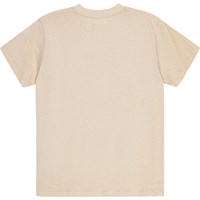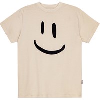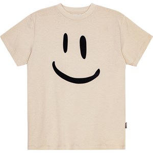 Molo x Plan International T-shirt in beige, made of organic cotton, with short sleeves and a round neckline. The T-shirt has a regular fit and a ribbed trim on the neckline. On the front, there is a large black smiley face. Read more about Molo X Plan International here.