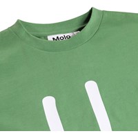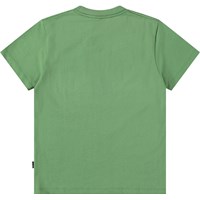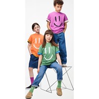 Green T-shirt made of soft organic cotton with short sleeves and ribbed neckline. The T-shirt has a loose fit with a print of a smiling face.