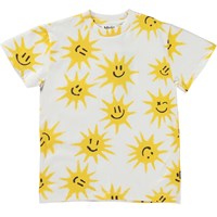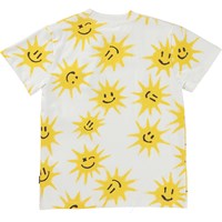 Roxo is a white, unisex, crewneck t-shirt with a print of small yellow suns that are smiling. The t-shirt has short sleeves.