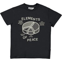 Roxo is a white, unisex, crewneck t-shirt with the text 'Elements of peace' and a print of a pie chart, in several colours, that shows what would be needed to create peace. The t-shirt has short sleeves.