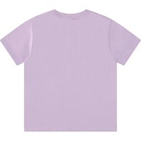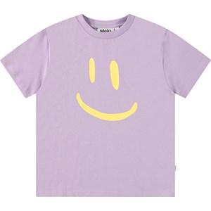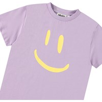 Purple t-shirt in organic cotton with short sleeves and ribbed neckline. The t-shirt has a loose fit and a large yellow smiling face on the front.