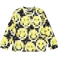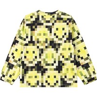 Black and yellow top in organic cotton with a round neckline, long sleeves, and ribbed trim at the neckline and sleeves. The top has a loose fit and an all-over print of smiling, pixelated faces.