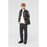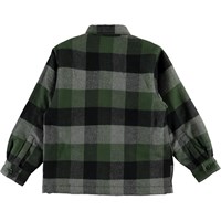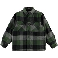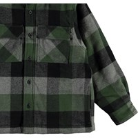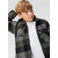 Hayes is a green, black and grey plaid overshirt jacket. It has patch pockets on the chest, a collar and a button closure as well as side pockets.