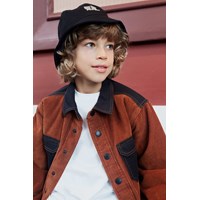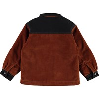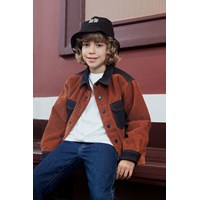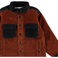 Henley is a brown overshirt jacket in corduroy. The jacket has black front pockets on the chest and collar and it has a botton closure. The Jacket has side pockets.