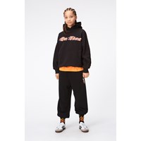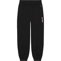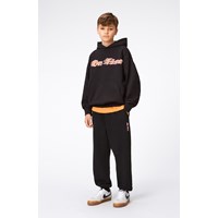 Black sweatpants in 100% organic cotton with a placement print on the front in orange and purple. The print has "On Fire" written in flaming letters down the sides. The text is printed in orange with a raised purple outline. The sweatpants have elastic at the waist with an inner drawstring. They have elastic at the legs, side pockets and a single back pocket. The sweatpants are in a regular fit. You can wear them with the Maxx hoodie in the same colour and print for a perfect set.