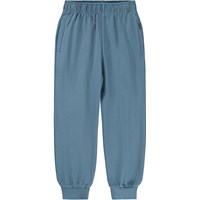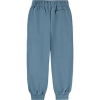 Blue sweatpants made of organic cotton with an adjustable elastic waist, side pockets, a single back pocket and elastic around the ankles. The sweatpants have a regular fit.