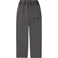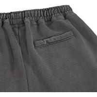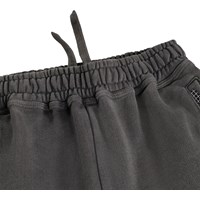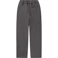 Dark grey sweatpants made of soft organic cotton with a print. The sweatpants have straight legs, side pockets, a back pocket, and an elastic waist with a drawstring for optimal fit and comfort.