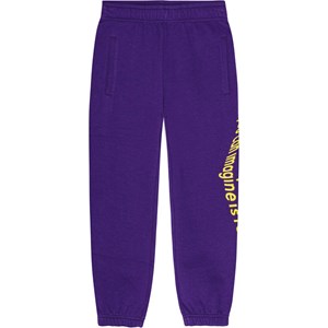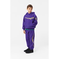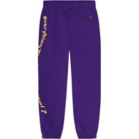 Purple sweatpants in organic cotton with an adjustable elastic waist, side pockets, a simple back pocket, and elastic at the ankles. The trousers have a regular fit and a printed text "Everything you can Imagine is Real" running down the leg. The trousers have a brushed inner face, making them soft and warm to wear.