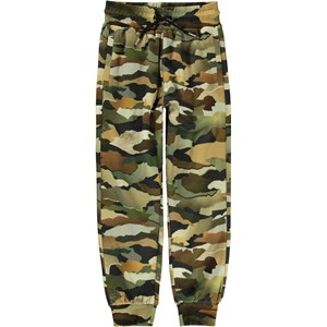 Alvar is a pair of sporty sweatpants with a camouflage print. They have a wide elastic waist and zip pockets.
