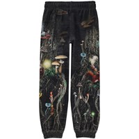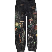 Black jogger sweatpants with a print of the mysterious root system of mushrooms and trees. You are completely surrounded by nature in this print, and you can imagine what it's like being a plant or an animal in the scene. The body is the trunk of the tree that stands solidly planted with all the forest's animals, plants and mushrooms inhabiting it. The sleeves are branches that can embrace the world and stretch up towards the sky. The joggers show the world that exists below the ground in the root system of the trees. These joggers are constructed in 100% cotton and they have elastic and inner ties at the waist. The joggers have elastic at the ankles and side pockets. They are in a regular fit. Wear the joggers with the Matttis sweatshirt in the same print for the perfect set