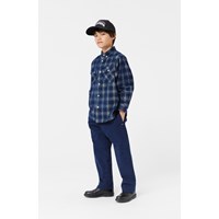 Dark blue cotton trousers with an elastic waistband and an internal drawstring. The trousers are equipped with side pockets and have a loose fit.