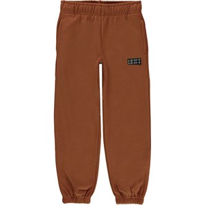 Ams is a pair of brown sweatpants with a Molo logo on the front. They have elastic at the waist and legs..