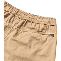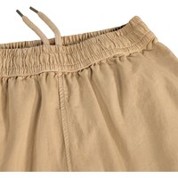 Beige trousers made of soft, organic cotton in a relaxed and comfortable fit. The trousers have side pockets, back pockets, and an elastic waist with an internal drawstring which ensure a good fit.