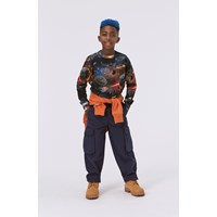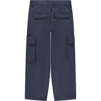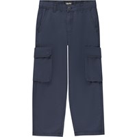 Dark blue cargo trousers with pockets on the legs. These trousers are constructed in 100% cotton, and they have side pockets, two back pockets and pockets on the legs. They are in a loose fit, and the waist can be adjusted with inner elastic so they fit all children perfectly. Sizes 92-134 have a snap closure to make them easy to pull on and off. Sizes 140-176 have a regular jeans button.