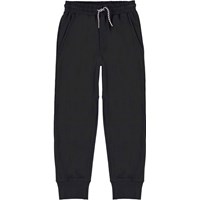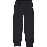 Avant is a pair of black sweatpants with rib at the ankles and elastic with ties at the waist. Avant has pockets and a patch pocket on the back. This Molo product is made of certified organic cotton.