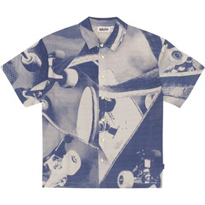 Black, grey and white shirt in viscose in an '80's vibe. The shirt is in a loose fit and has long, loose sleeves, a white button front closure and a classic straight collar. The print on the shirt is inspired by the skater world and is in an all over print of skateboards seen from every angle. Wear it with the matching shorts for a really cool set.