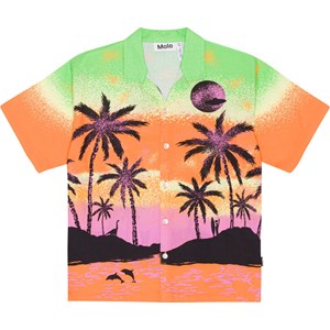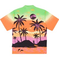 Rui is a short sleeve shirt in 100% organic cotton with a placement print. The print is a classic Hawaii motif with a twist, palm trees and a sunset in shades of black, orange, green and purple. Can you spot a surfer alien or maybe other guests? This shirt has short sleeves, a button front closure and is in a regular fit. For an extra cool look, you can wear it with the matching Adi shorts in the same print.