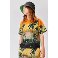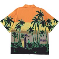 Rui is a Hawaii shirt in orange and yellow with a print of a beach with neon green palm trees. The shirt has a boxy fit and is made in organic cotton. Wear it with matching shorts for a complete summer outfit.