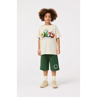 Cool, dark green basketball shorts in organic cotton. These shorts have a loose fit, elastic waistband with a drawstring, side pockets, and a single back pocket. Circular embroidery at the bottom of one leg with the text 'World United Win Win'.