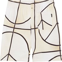 Shorts in organic cotton with a black and cream coloured basketball print. The print is an allover print, that mimics the lines on a basketball court. Some of the lines have been changed to form a peace sign. The shorts end at the knee and are in a regular fit. They have an adjustable elastic waist, side pockets and a single back pocket.