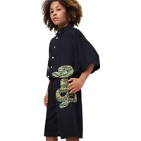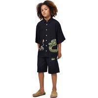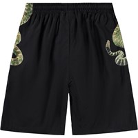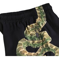 Black shorts made of soft viscose with a snake print. They have an elastic waist with drawstring, side pockets, and a loose, comfortable fit – perfect for warm summer days.
