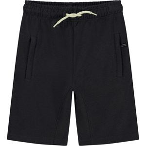 Aliases is a pair of black shorts in organic cotton. There are front pockets with concealed zippers, and the back has a single pocket. Aliases has a white drawstring at the waist.