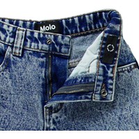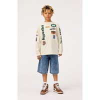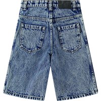 Long, blue denim shorts in organic cotton. The shorts have a loose fit, reach the shins, and have pockets on the sides as well as back pockets.The waistband can be adjusted with an internal elastic, ensuring a perfect fit for all children. Sizes 92-134 have a snap button, making it easy to take the shorts on and off, while sizes 140-176 have a regular jeans button.