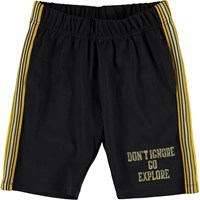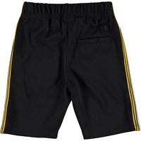You don't have to sit still in a pair of Ari shorts. They look good but are still perfect for a football match, a game of hoops etc. They are black with yellow and white stripes down the side. They have an elastic waist and text down the legs.